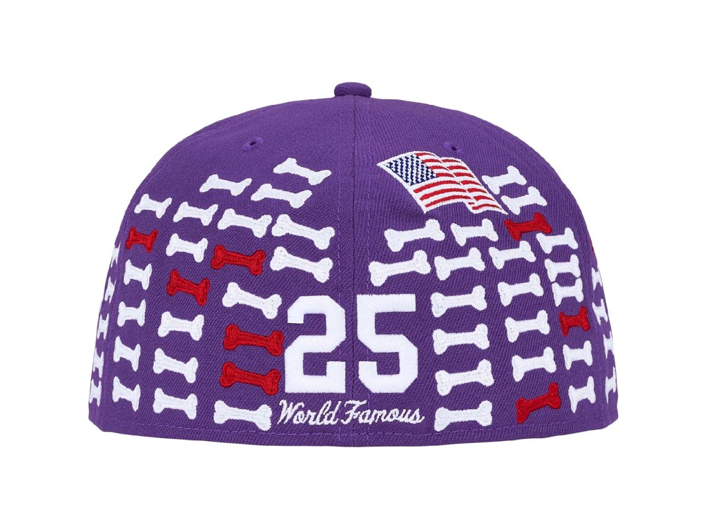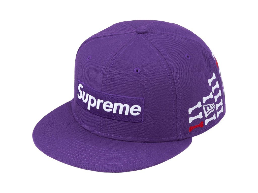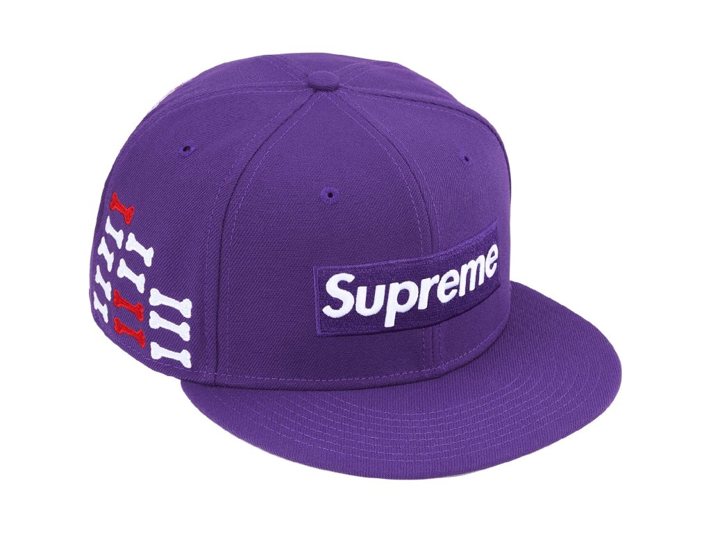 Supreme Bones Box Logo New Era® ve fialové barvě z kolekce Fall/Winter 2025. Výrazná fitted kšiltovka s ikonickým Bones Box logem, vydaná 18. 9. 2025.