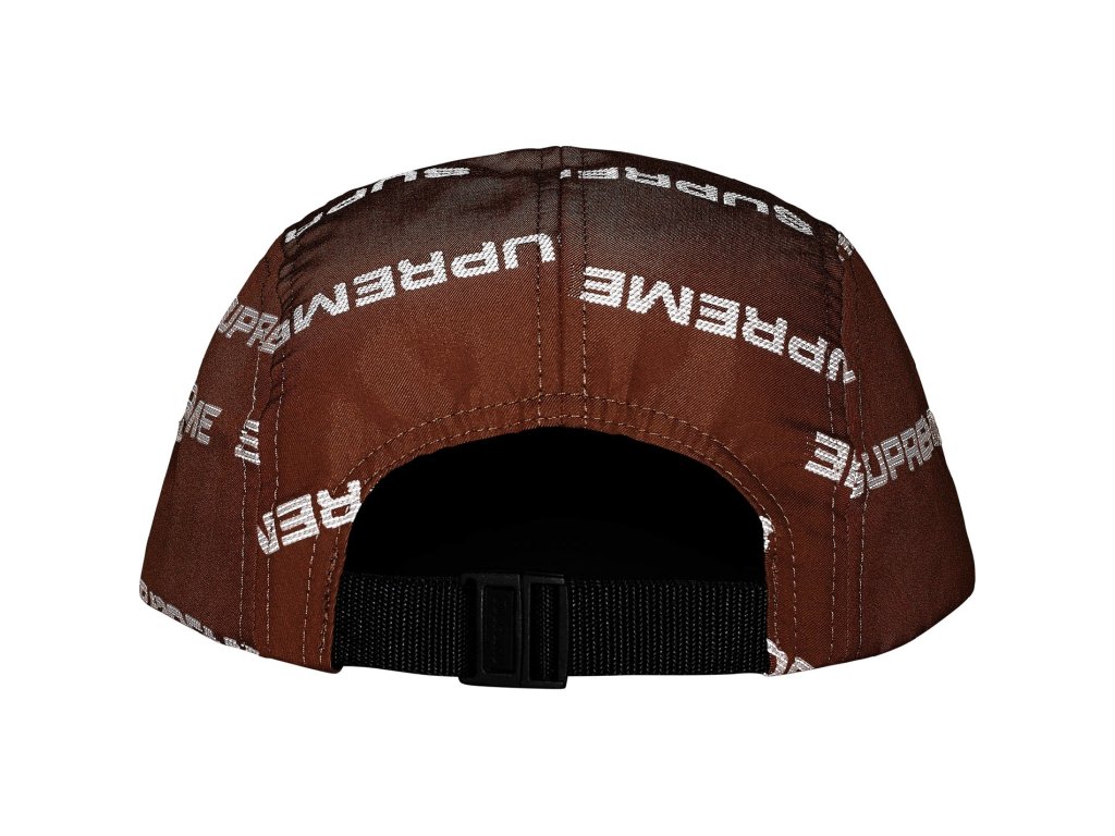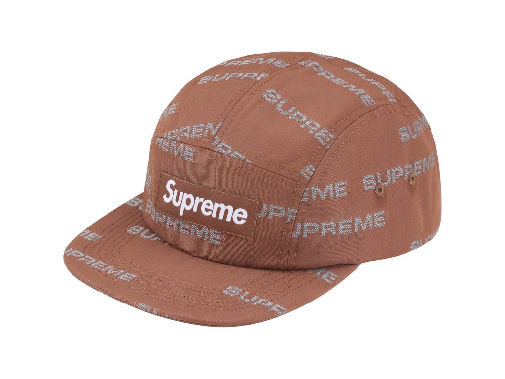 Supreme Reflective Jacquard Camp Cap v hnědé barvě z kolekce Fall and Winter 2024. Stylová kšiltovka s reflexním designem, ideální pro moderní vzhled a pohodlné nošení.