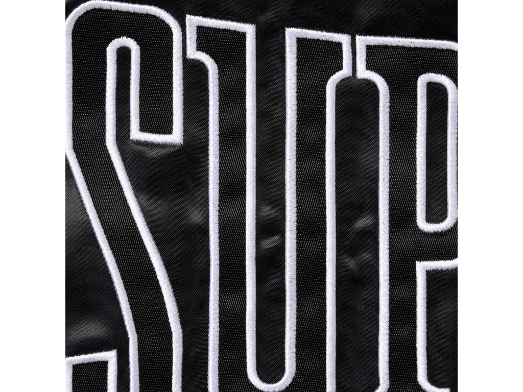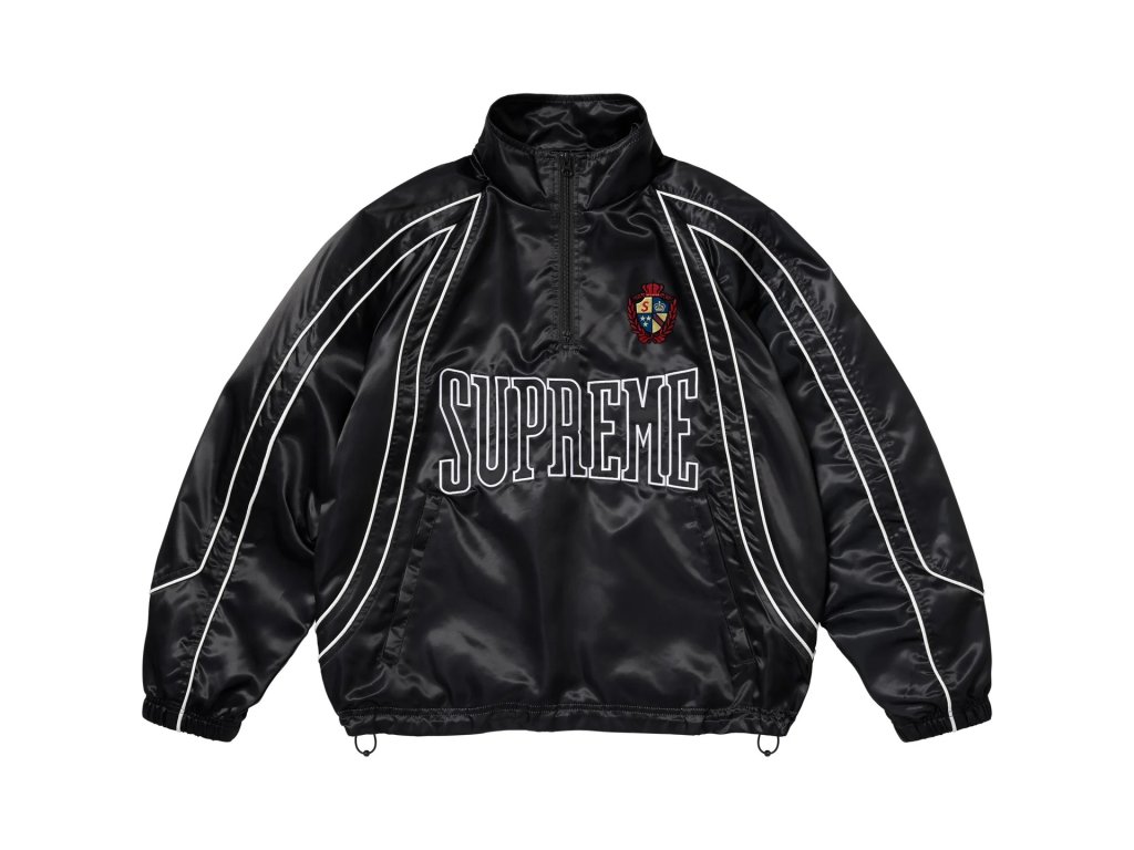 Supreme Satin Piping Pullover / Black z kolekce Spring/Summer 2025. Elegantní černá saténová bunda s výrazným lemováním, ideální na jaro a léto.